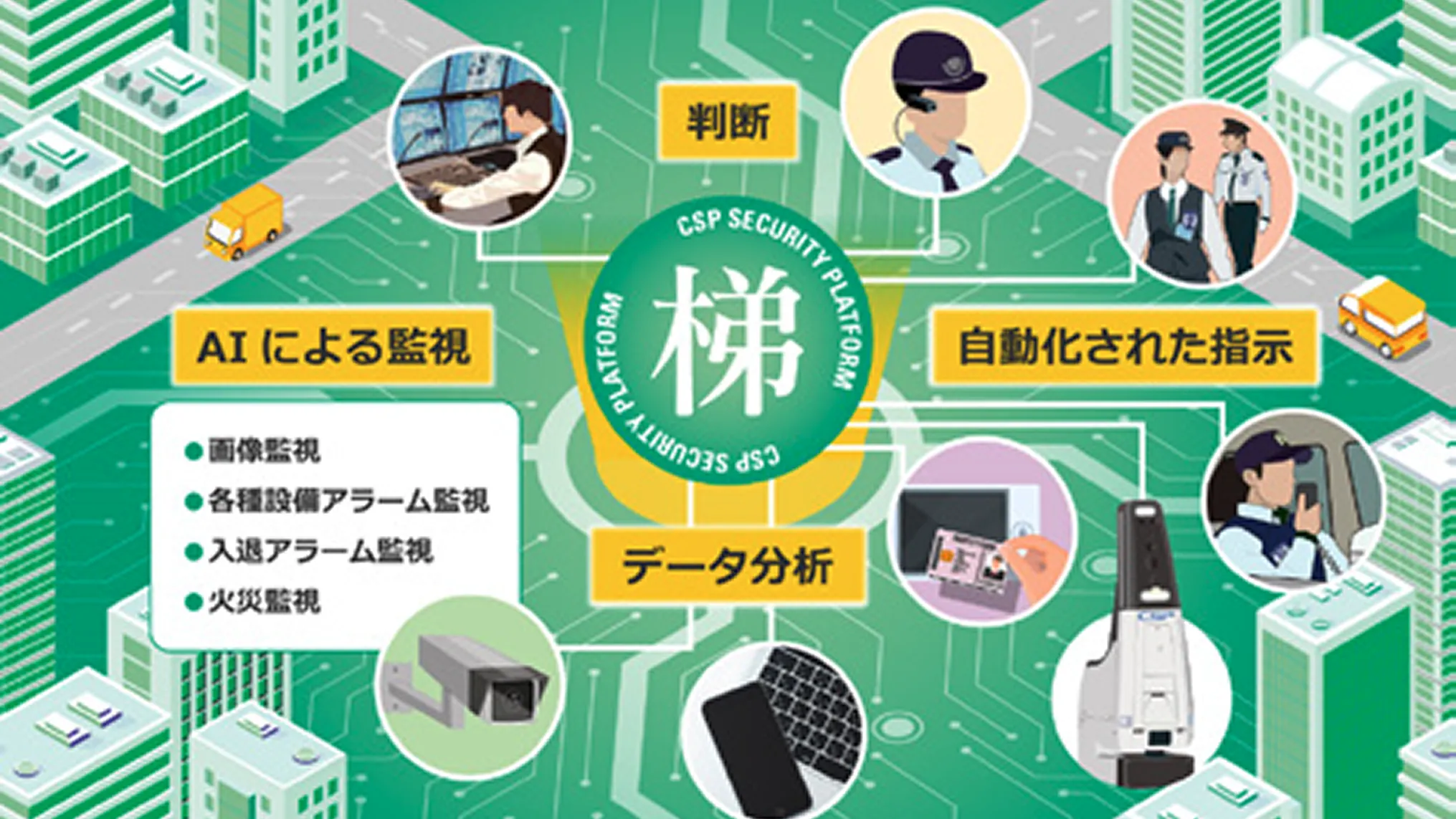 これまで人が行っていた警備情報の収集・伝達・確認をネットワーク技術により実施することで、より高度なセキュリティサービスを実現するのがセキュリティプラットフォーム「梯(かけはし)」です。