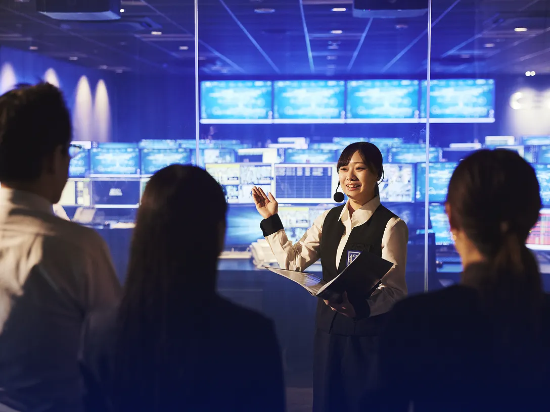 OJT研修を受けながら、お客さま対応や防犯システムの知識を修得し、“警備員”としての基礎を学びます。先輩社員が同行し、不安はすぐに解消できる環境があります。